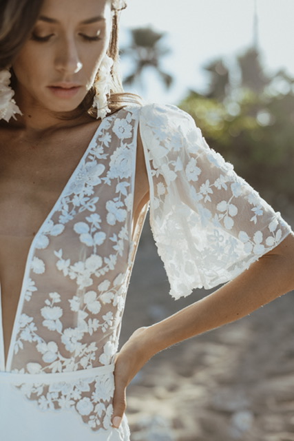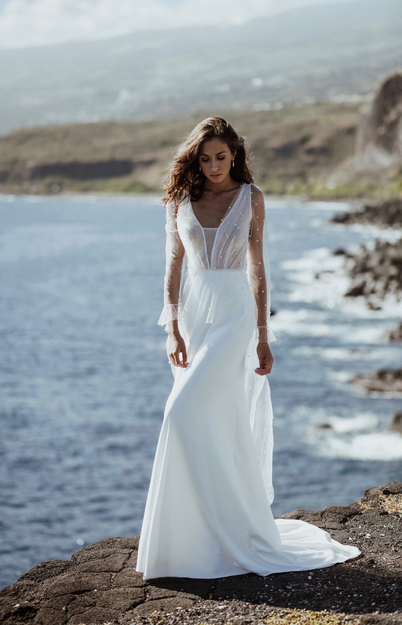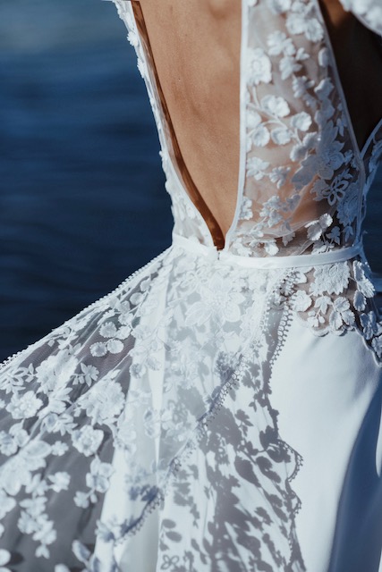 Robe de mariée Isna Issue des Archives de la Maison Fabienne Alagama, cette robe incarne une féminité solaire et affirmée, où la pureté des lignes dialogue avec un travail de dentelle d’exception. Le haut en dentelle de Calais, au motif délicat et raffiné, épouse le buste avec légèreté. Travaillée en transparence, la dentelle se prolonge dans un dos nu en forme de cœur, signature sensuelle et poétique de la pièce, révélant la peau avec douceur et élégance. La jupe, à la ligne fluide et épurée, accompagne le mouvement avec naturel et équilibre la silhouette, laissant toute sa place à la précision de la coupe et à la noblesse des matières. Pensée comme une création à la fois romantique et contemporaine, cette robe révèle un savoir-faire couture où chaque détail est maîtrisé, dans l’esprit libre et lumineux de la Maison Fabienne Alagama. Proposée en série limitée, cette pièce d’archives témoigne de
