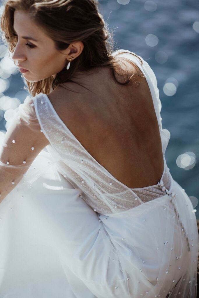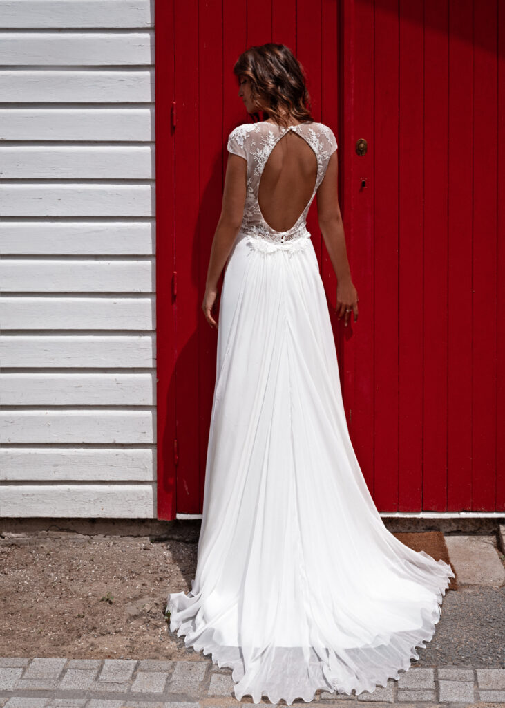 Le haut en dentelle de Calais, au motif délicat et raffiné, épouse le buste avec légèreté. Travaillée en transparence, la dentelle se prolonge dans un dos nu en forme de cœur, signature sensuelle et poétique de la pièce, révélant la peau avec douceur et élégance.