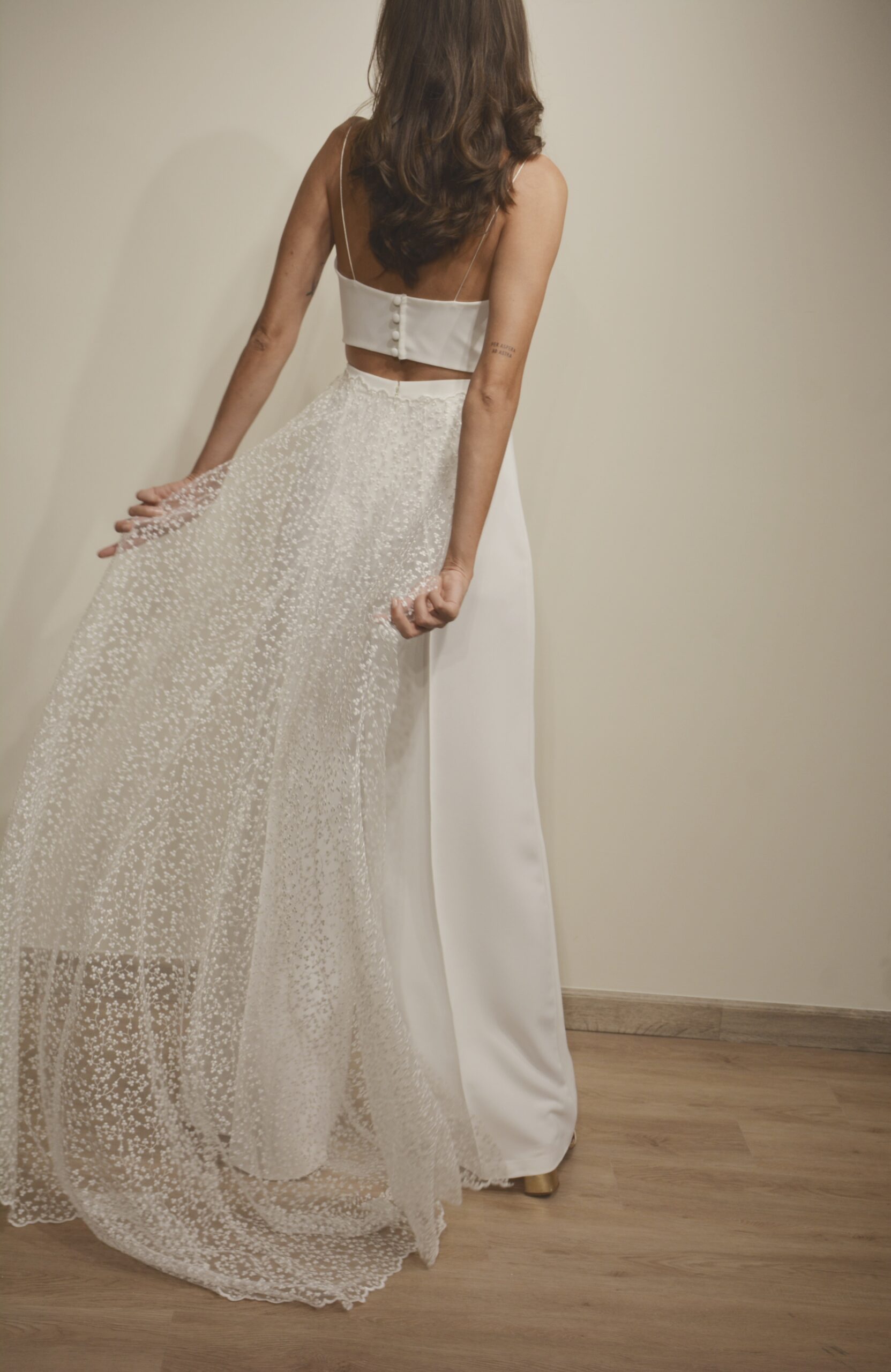 Top et pantalon Lila légant et délicatement sophistiqué, l’ensemble Lila séduit par son jeu de superpositions et sa féminité moderne. Le top en tulle finement brodé dévoile une sublime encolure américaine qui met en valeur les épaules et le port de tête. Ses motifs floraux délicats créent un effet aérien et romantique, tout en laissant subtilement apparaître un crop top bustier structuré porté en dessous. Cette superposition apporte maintien, confort et contraste, équilibrant transparence et structure avec raffinement. Le pantalon taille haute, à la coupe longue et fluide, allonge la silhouette et souligne la taille avec élégance. Son tombé net et épuré apporte modernité et sophistication à l’ensemble. L’ensemble Lila est idéal pour une mariée contemporaine en quête d’une tenue à la fois délicate, originale et parfaitement construite. ✨ Détails : Top en tulle brodé Encolure américaine Superposition avec crop top bustier structuré Motifs floraux délicats Pantalon taille haute Coupe