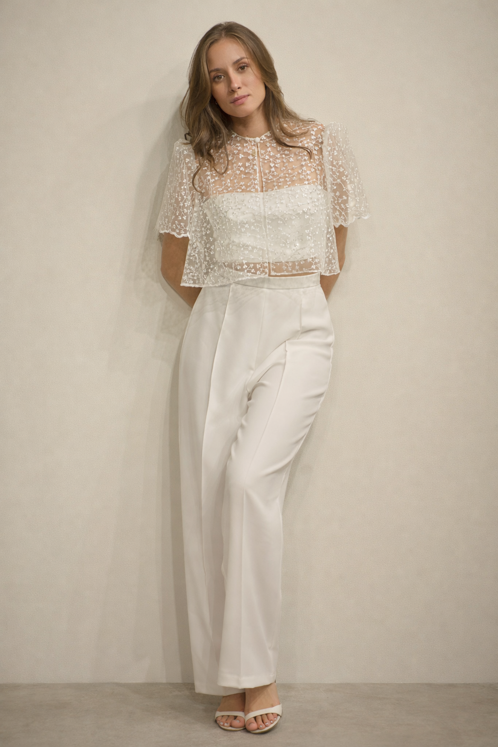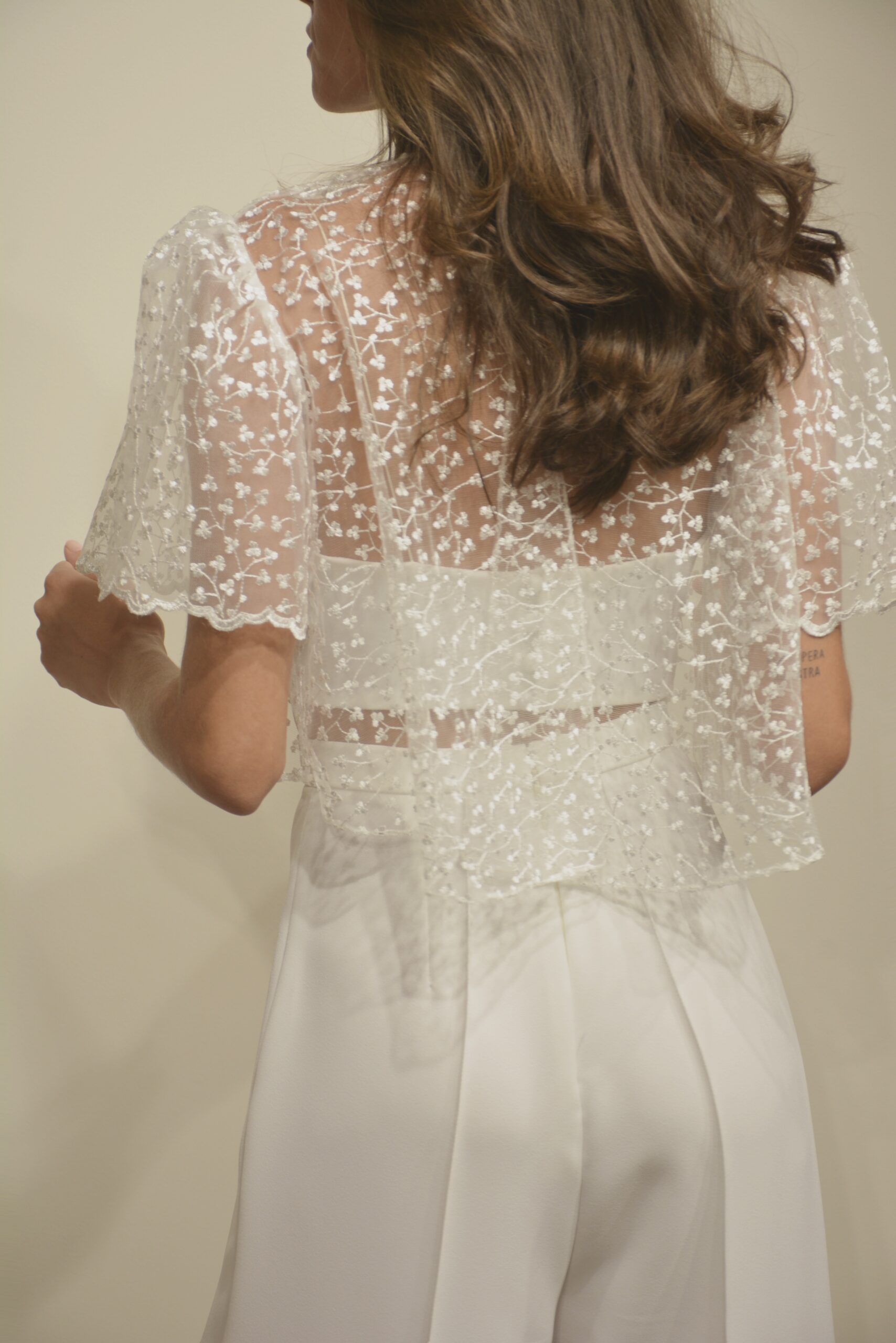 Top et pantalon Roxane Délicat et lumineux, l’ensemble Roxane allie romantisme et modernité dans une silhouette élégante et aérienne. Le top en tulle brodé joue sur la transparence avec subtilité. Son encolure montante et ses manches courtes volantées apportent une touche rétro chic, tandis que la superposition délicate laisse apparaître un trop top en dessous, créant un contraste raffiné entre légèreté et maintien. Le pantalon taille haute à la coupe fluide élance la silhouette et équilibre parfaitement la finesse du haut. Sa ligne épurée apporte modernité et confort, pour une allure sophistiquée sans effort. L’ensemble Roxane est idéal pour une mariée civile ou pour celles qui recherchent une tenue élégante, originale et résolument contemporaine. ✨ Détails : Top en dentelle brodée transparente Encolure montante Manches courtes volantées Effet superposition avec bustier Pantalon taille haute Coupe fluide et élégante Un ensemble raffiné et féminin, parfait pour une allure douce, moderne et