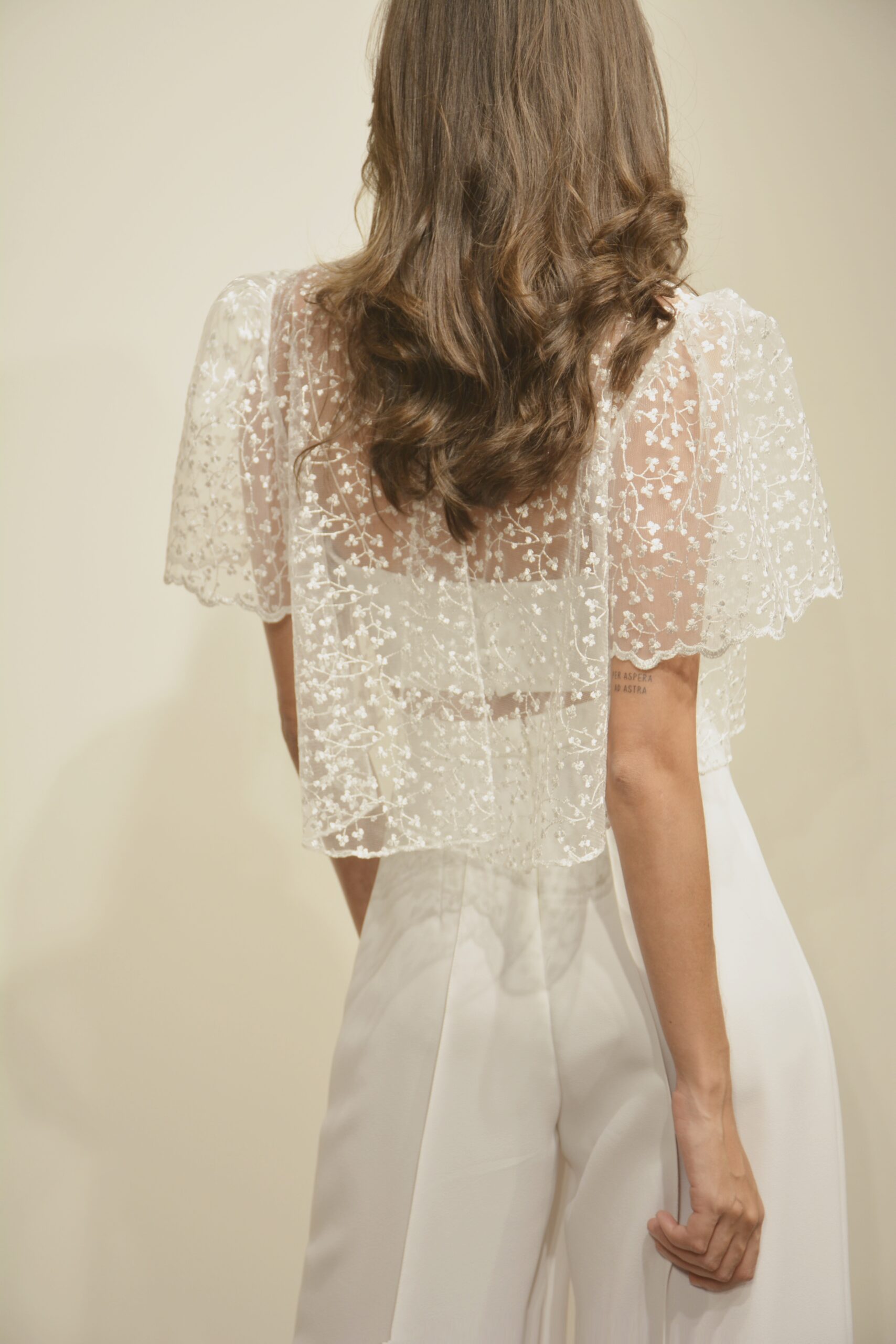 Top et pantalon Léa Léa incarne une mariée résolument mode, entre lumière subtile et allure architecturale. Le top en tulle brodé perlé joue la transparence avec délicatesse. Son motif graphique délicatement scintillant capte la lumière à chaque mouvement, tandis que sa coupe courte et légèrement ample crée une silhouette aérienne. De face, la ligne est épurée et contemporaine ; de dos, l’ouverture profonde dévoile la peau avec élégance et audace. Associé à un pantalon fluide taille haute, l’ensemble allonge la silhouette et apporte une modernité assumée. La fluidité du bas contraste avec la légèreté texturée du tulle, créant un équilibre parfait entre structure et mouvement. Idéal pour une cérémonie civile, un mariage urbain ou une mariée qui souhaite sortir des codes traditionnels, Léa se distingue par son éclat discret et son minimalisme sophistiqué. Une silhouette lumineuse, libre et intensément actuelle. Guide des tailles