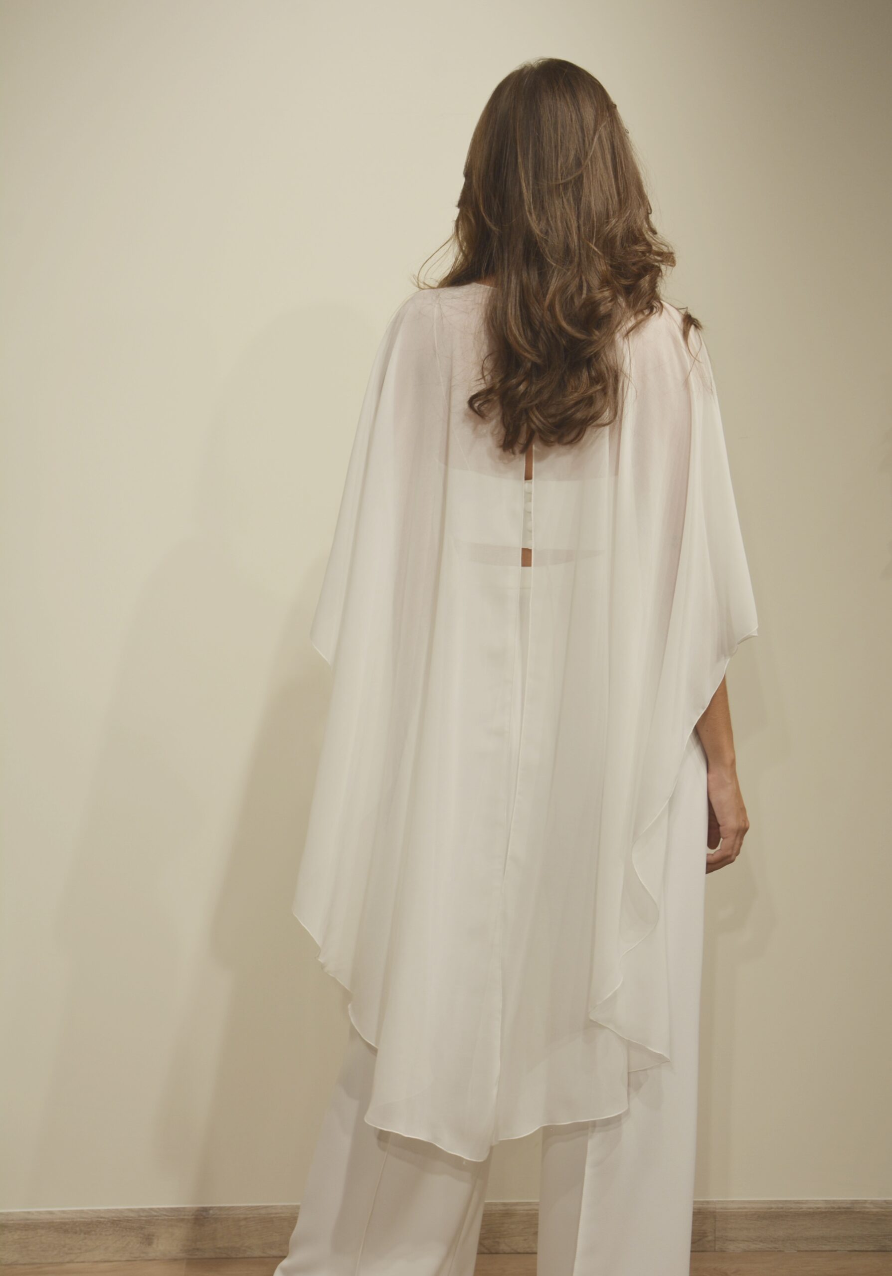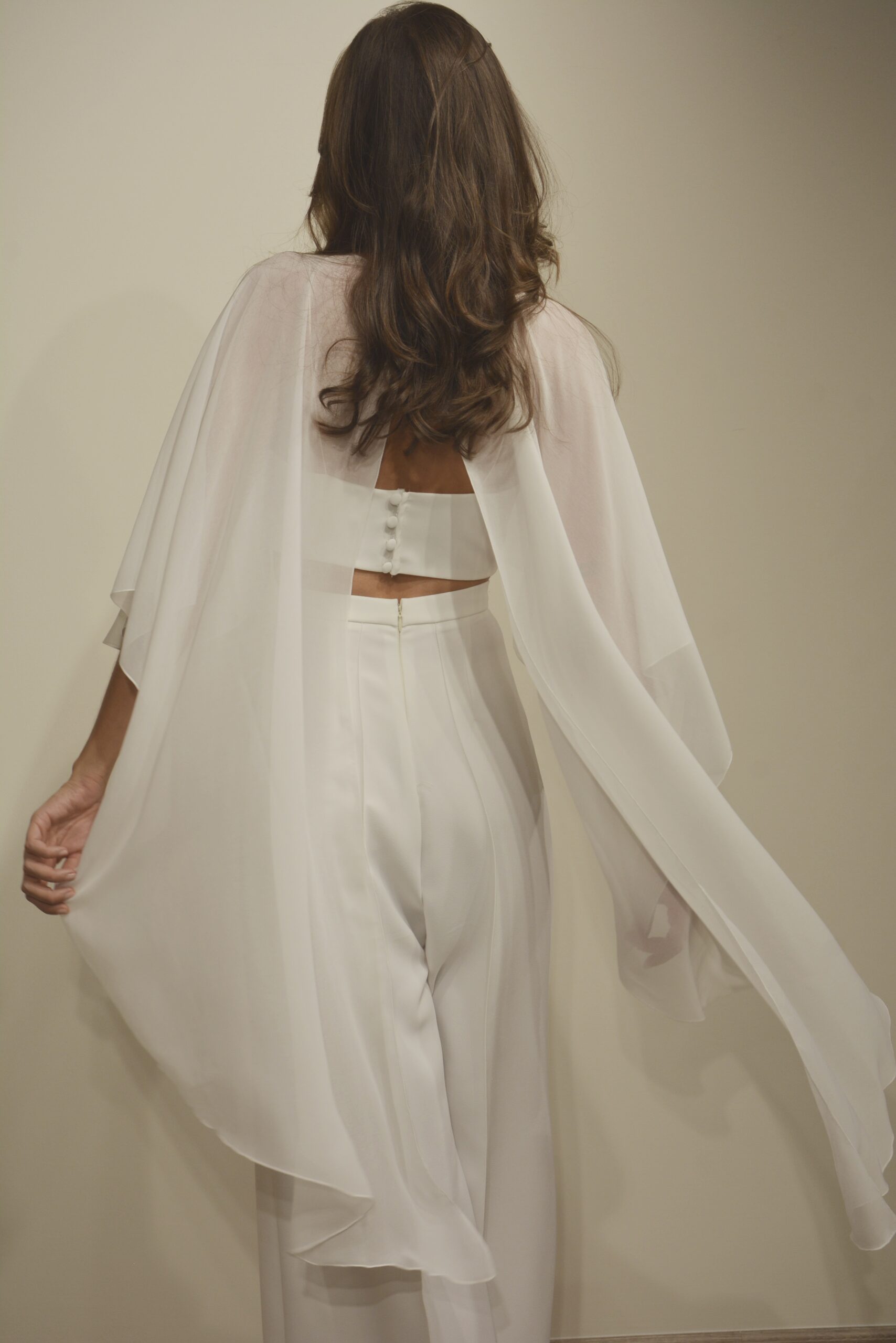 Le top court, structuré par une base épurée, est recouvert d’une étole aérienne. Légère et vaporeuse, elle apporte mouvement et douceur à la silhouette tout en laissant subtilement apparaître la taille. Au dos, de jolis boutons viennent parfaire la finition avec raffinement.
